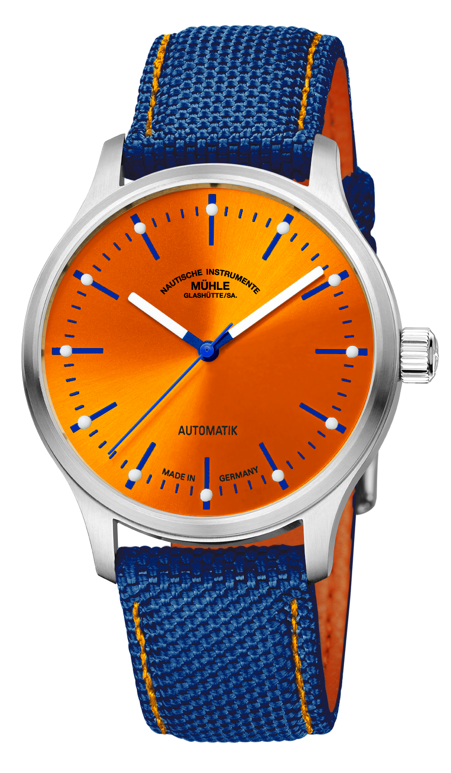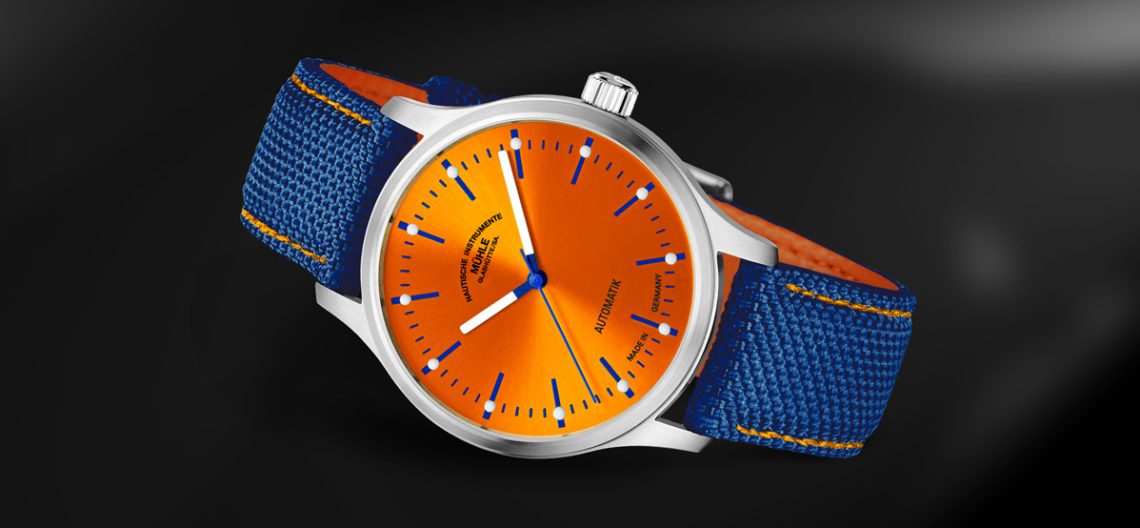 Ebenfalls in die Farben Orange und Blau ist das Canvas-Armband der Uhr gekleidet. Denn das blaue Armband besitzt nicht nur eine orangefarbene Kontrastnaht, sondern auch ein gleichfarbiges Innenleder. Das verschafft der Panova Orange „Edition N.I.M.O.C.“ einen äußerst harmonischen und Mühle-typischen Auftritt.