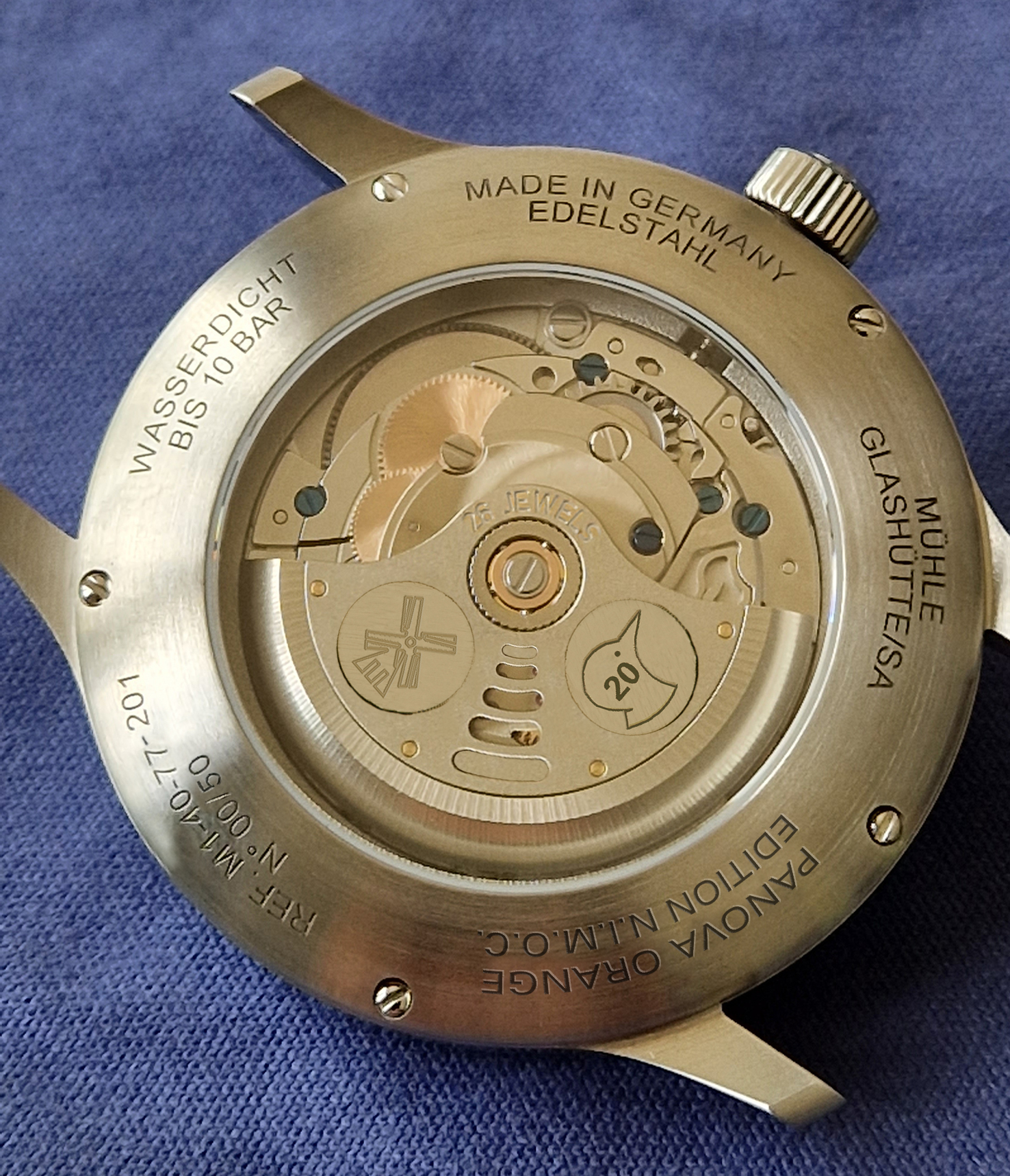Die Panova Orange „Edition N.I.M.O.C.“ wurde gemeinsam mit den Mitgliedern des Nautische Instrumente Mühle Owners Club entwickelt, von denen die Idee zur Fertigung einer exklusiven Forums-Uhr stammt. Wie es auch bei den Einsatzuhren von Mühle-Glashütte üblich ist, wurde die „Edition N.I.M.O.C.“ Schritt für Schritt mit den Initiatoren abgestimmt. Eine Uhr von Mühle-Fans für Mühle-Fans sozusagen!