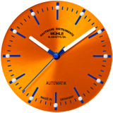 Durch das Saphirglas kann man das aktive Lichterspiel des geschliffenen, orangefarbenen Zifferblatts jederzeit ungetrübt bewundern. Dieses prägt das gesamte Erscheinungsbild der Mühle-Uhr und lässt das Zifferblatt – mal heller, mal dunkler – in verschiedensten Nuancen erstrahlen. Seine blauen Stundenindizes sind mit erhabenen Leuchtpunkten versehen. In Kombination mit den ebenfalls nachleuchtenden Zeigern ermöglichen sie eine perfekte Ablesbarkeit der Uhr bei Tag und Nacht. Wie jede Mühle-Uhr besitzt die Panova Orange „Edition N.I.M.O.C.“ damit die Attribute eines höchst alltagstauglichen Zeitmessers.