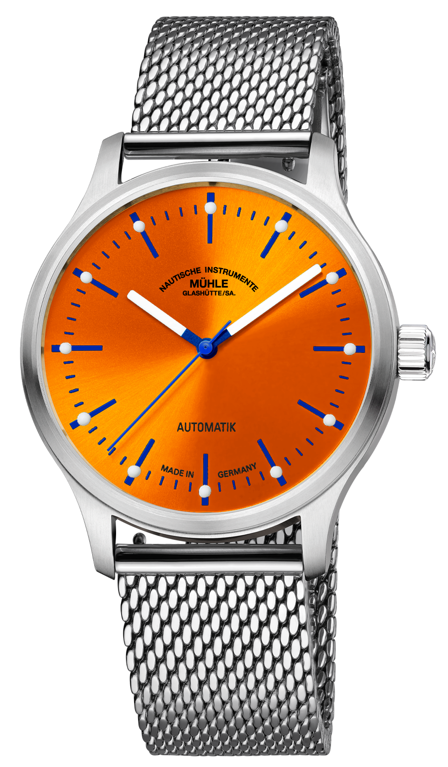 Aber auch dank ihrer nautischen Tugenden – hohe Präzision, gute Ablesbarkeit und Robustheit – ist die Mühle-Uhr auf jeder Bühne ein verlässlicher Partner am Handgelenk. Dafür steht vor allem das hochwertige Edelstahlgehäuse. Es ist bis 10 bar wasserdicht und besitzt neben einer verschraubten Krone ein entspiegeltes, kratzfestes Saphirglas.
